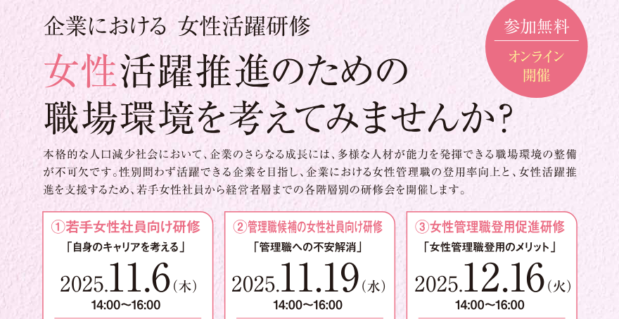 本格的な人口減少社会において、企業のさらなる成長には、多様な人材が能力を発揮できる職場環境の整備が不可欠です。性別問わず活躍できる企業を目指し、企業における女性管理職の登用率向上と女性活躍推進を支援するため、若手女性社員から経営者層まで...