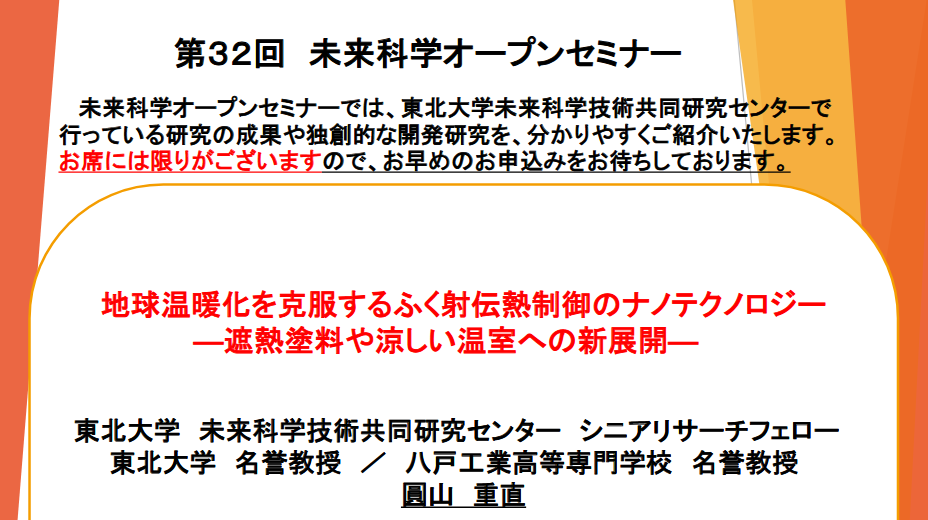 第32回は、東北大学未来科学技術共同研究センター シニアリサーチフェロー圓山重直氏より~地球温暖化の克服に向けた「ふく射伝熱制御のナノテクノロジー」。遮熱塗料や涼しい温室など、生活環境や農業分野への応用が期待される研究内容~を分かりやすくご...