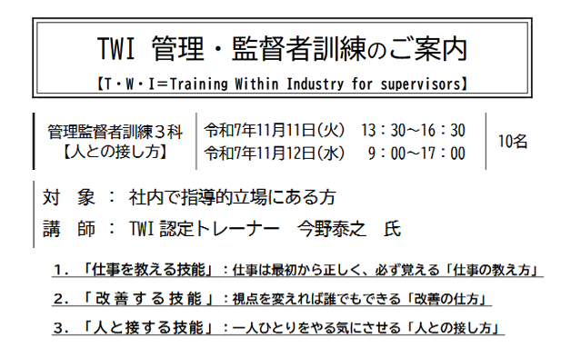 管理・監督者として、一人ひとりをやる気にさせる“接し方の技能”を職場の実例をもとに討議と実演を交えて学びます 職場の第一線、管理・監督者としての基本的な3つの技能1.「仕事を教える技能」:仕事は最初から正しく、必ず覚える「仕事の教え方」2....